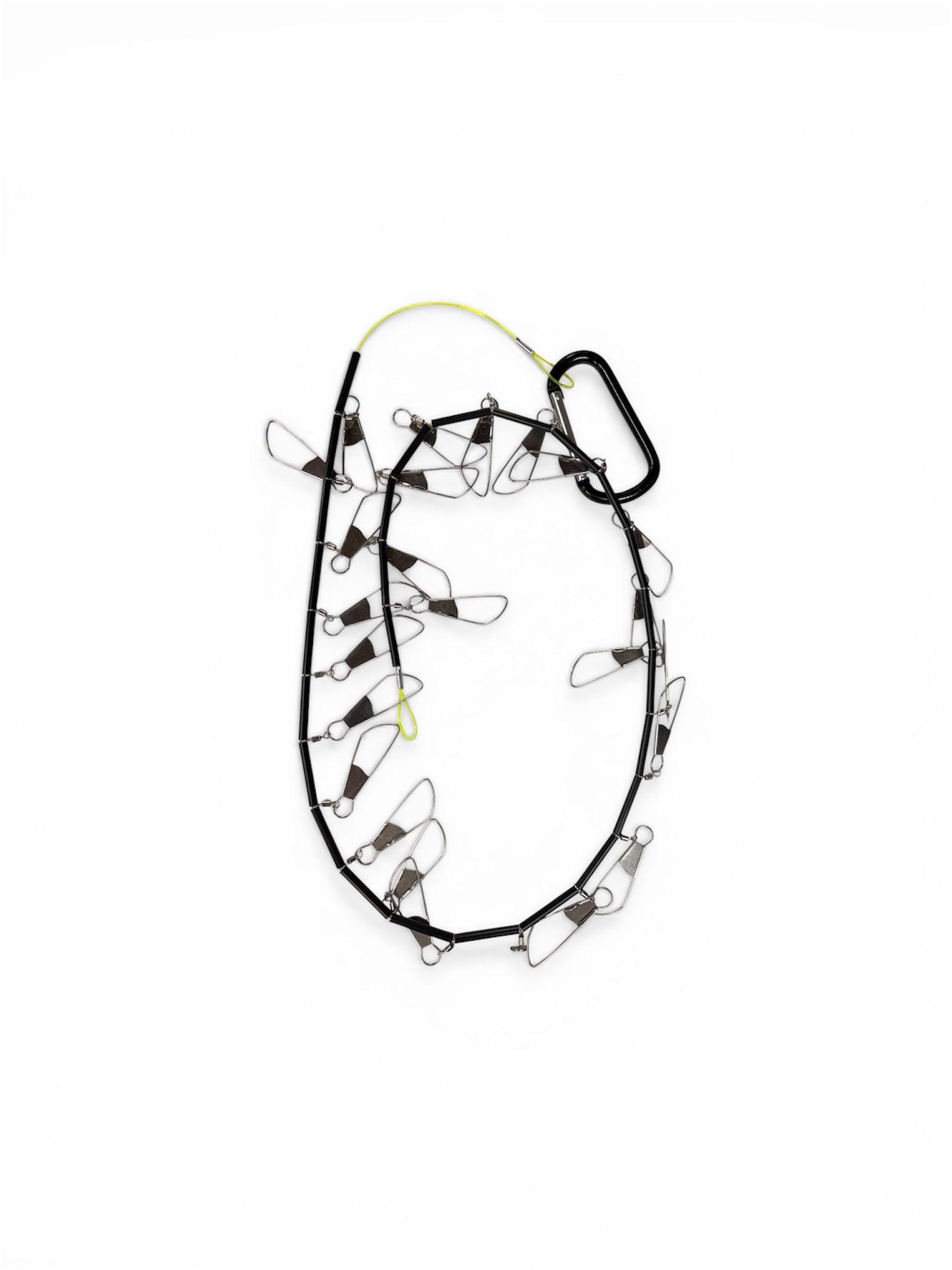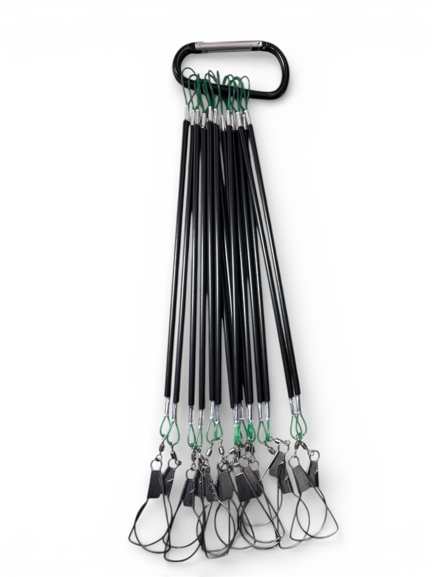 A fishing stringer designed by a kayak fisherman for kayak fishing. Most stringers are too long and can snag onto structure under the surface. If a rope is used you have to untie it every time you need to put another fish on. This stringer remedies those problems. The carabiner hooks to the side handles on most kayaks(for a kayak without side handles you can purchase the optional stainless steel eye nut and mount it to your gear track). The short leaders hold fish shallow. You can leave the leaders in the kayak until a fish is caught, then hook em up and drop em over, one at a time. The large carabiner also works as a handle when carrying your catch.